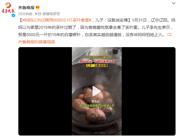 1月31日,辽宁辽阳。妈妈以为家里2018年的茶叶过期了,因为爸爸爱吃就拿去煮了茶叶蛋。儿子李先生表示,那是8000元一斤的18年的白毫银针,白茶其实越放越值钱,没告诉妈妈怕她上火。
