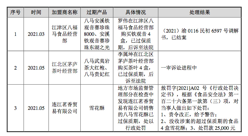 据八马茶叶早前向深交所创业板披露的招股书显示,该公司曾有3家加盟商出现过销售过期产品的行为,均出现在2021年,这三个案件中,有2起案件相关用户起诉到了法院,另外一个案件是地方市场监管部门在检查中发现了过期产品的销售,最终该加盟商被给予了2.5万元的罚款,并责令改正,给予警告。