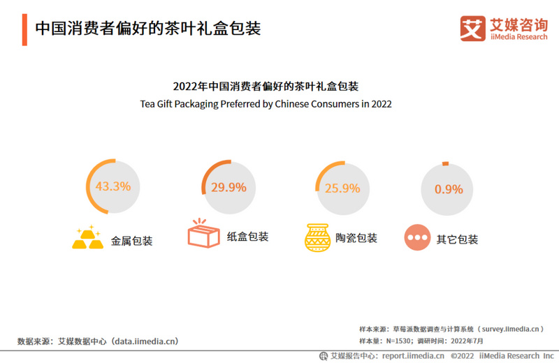 调研数据显示,2022年中国消费者最喜爱金属包装的茶叶礼盒,占比43.3%,其次是纸盒包装,占比29.9%。艾媒咨询分析师认为,相比陶瓷包装的易碎特点,金属包装和纸盒包装的礼盒在保持美观的同时更坚稳牢固,可避免送礼时出现礼品破碎的尴尬场景。