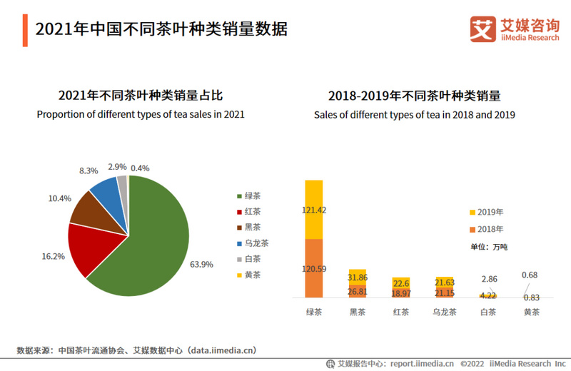 数据显示,2021年中国六大茶类销量中,绿茶内销量130.92万吨,占总销量的56.9%;红茶内销33.88万吨,占总销量的14.9%;黑茶内销34.41万吨,占总销量的14.7%;乌龙茶内销22.79万吨,占总销量的9.9%;白茶内销7.05万吨,占总销量的3.1%;黄茶内销1.14万吨,占总销量的0.5%。相比2018年与2019年,2021年六大茶叶销量均实现了增长。