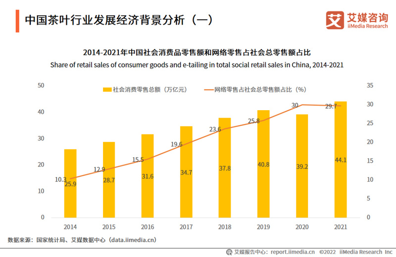 数据显示,除2020年受疫情影响导致出现波动以外,2014至2021年中国社会消费品零售总额和网络零售占社会总零售额占比总体双双呈现上涨趋势。尽管2021年网络零售占比略有下降,但降幅甚微。在直播电商的火爆发展下,网上零售模式在疫情期间成为经济增长的重要抓手。这在一定程度上推动了茶企业数字化的程度,并加快和加深线上渠道的业务布局。