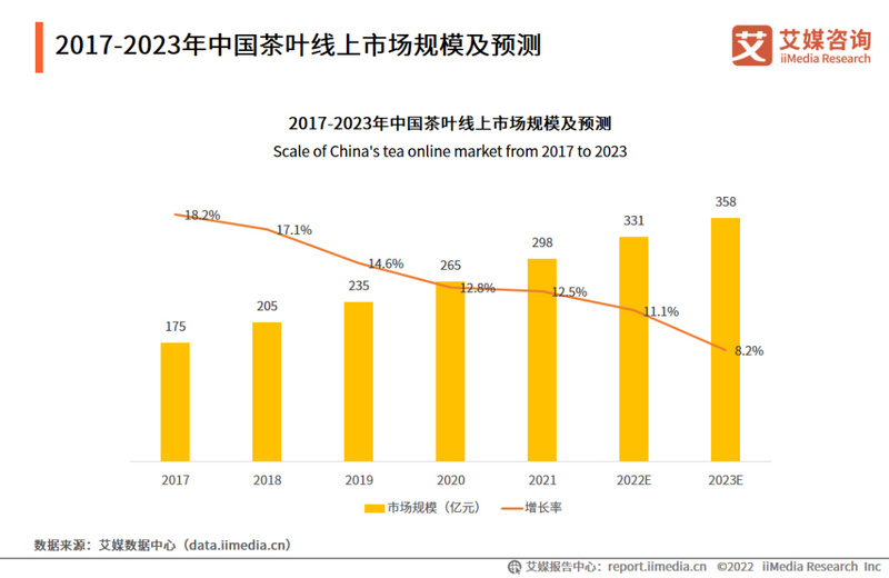 疫情期间,直播带货成为各行业进行营销的新模式,农产品也借助直播的东风开启线上营销模式,并取得较佳的成效。其中,茶企也在“直播热”的助力下不断加码线上营销,2021年中国茶叶的线上市场规模达到298亿元,同比增长12.5%,预计2023年可达358亿元。艾媒咨询分析师认为,未来,短视频、直播等线上营销将会成为茶企常态化的营销方式。