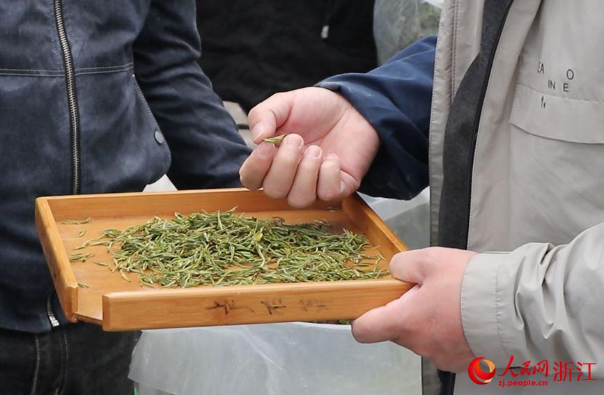 茶商将茶叶放在指尖轻轻揉搓判断品质。人民网 张帆摄