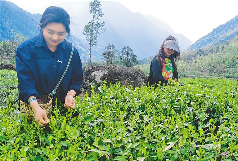 林芝市墨脱县地处雅鲁藏布江下游,湿润多雾,海拔适中,适合茶叶生长。格当乡位于墨脱县城西南方向,1800米的海拔更适宜种植高山有机茶叶。目前,格当乡共有9个茶场,占地千余亩,茶场产出的高品质茶叶已为当地村民创收10余万元。 图为游客在格当乡德吉村尼木登武警爱民茶场体验采茶。 郎玲 记者 旦增兰泽 摄