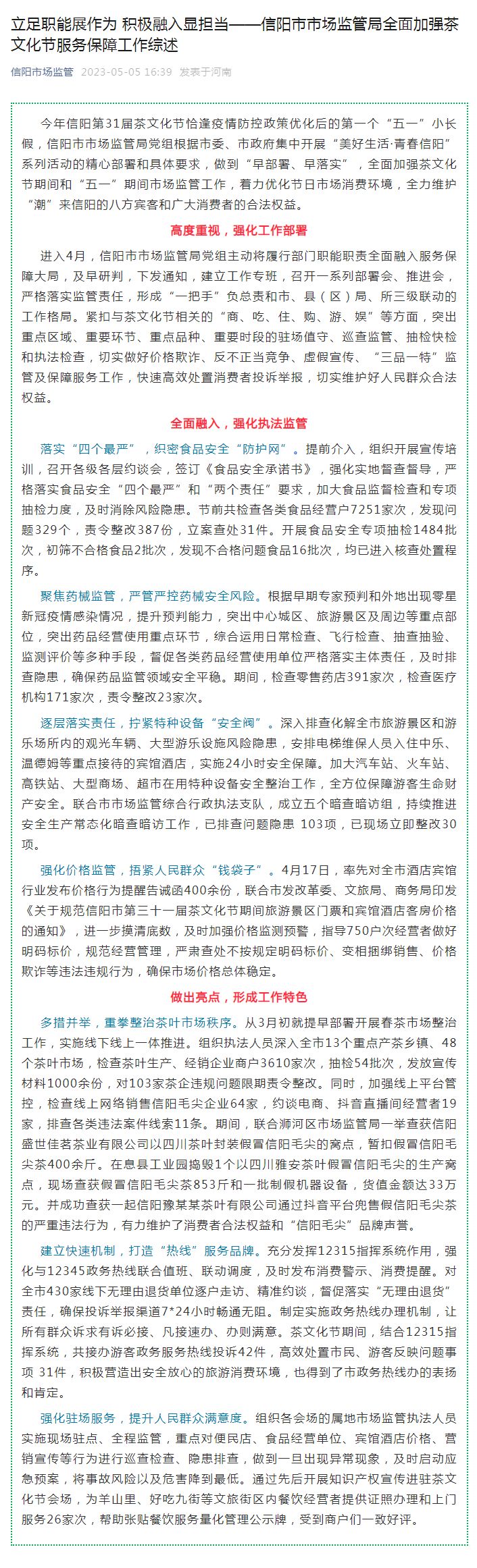 【暂扣假冒信阳毛尖茶400余斤,#信阳查获一茶企以四川茶叶假冒信阳毛尖#】多措并举,重拳整治茶叶市场秩序。从3月初就提早部署开展春茶市场整治工作,实施线下线上一体推进。组织执法人员深入全市13个重点产茶乡镇、48个茶叶市场,检查茶叶生产、经销企业商户3610家次,抽检54批次,发放宣传材料1000余份,对103家茶企违规问题限期责令整改。同时,加强线上平台管控,检查线上网络销售信阳毛尖企业64家,约谈电商、抖音直播间经营者19家,排查各类违法案件线索11条。