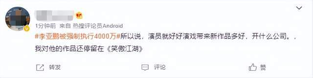 4月28日,实力派男演员李亚鹏通过微博回应了被强制执行4000万一事,表示已经跟债主商定好了还款计划,而这次被法院强制执行只是一个常规流程,不想做过多的解释。