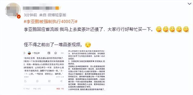 除了网友或支持或调侃以外,就连不少大V也都迅速加入到了讨论浪潮当中,然后以课代表的身份做出了总结,说李亚鹏绕来绕就是想告诉大家,他现在直播卖茶叶就是为了还债,希望能够得到大家的支持,那就是用实际行动掏腰包买点茶叶回家...
