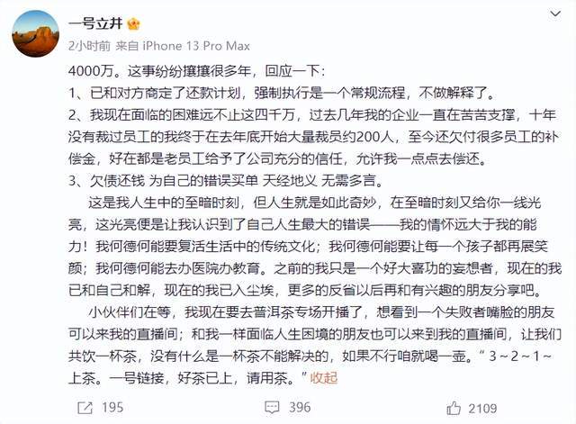 其实从李亚鹏回应的内容当中,可以看出他非常的无奈,同样也很心力交瘁,因为巨大的债务危机确实客观存在,如同一座座大山压着他快要喘不过气来。即便如此,他还是得面去面对这些问题,去解决这些问题,至少责任担当是有的。