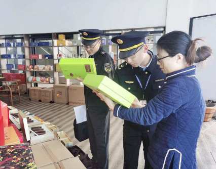图为执法人员正在检查茶叶包装是否合规。