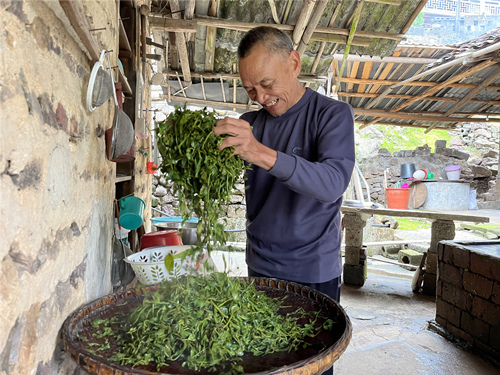 正好清明连谷雨,一杯香茗坐其间。4月10日,湖南江永源口瑶族乡横开河村民唐石贵和老伴背着竹篓上山采摘大叶茶,留住“春天”的味道。 今年70岁的唐石贵一边麻利的将色泽翠绿,叶质柔软的鲜茶叶放进背篓,一边开心的说,大叶茶是瑶山油茶的主要原食材,从清明节到谷雨前是最佳的茶叶期。如果时令过了,节气不对,产出的茶叶就没有香味,打出的油茶也不好喝。这里的瑶民家家户户都采摘茶叶,一人一天可以采摘12斤茶叶,4斤鲜茶叶只能制作1斤干茶叶。制作成品茶只需炒熟、搓拢、晒干、烟熏四道工序。 唐石贵憨态可掬、满脸笑容,常年居住在源口瑶族乡三源村的大山深处。同时的三个子女在外打工,两老口住着几间老屋。憨态可掬、满脸笑容,常年居住在源口瑶族乡三源村的大山深处。 油茶有健胃去寒的功效,被誉为"神仙汤"。在江永瑶寨,瑶胞们一日三餐都喝油茶,有“宁可一餐无饭,不可一日无茶”之说。喝油茶是唐石贵老人的最爱,一日三餐不间断。“我不喝油茶心情就不愉快,和发病一样,一天要和四五餐。所以我每年要制作干茶叶100多斤。” 源口瑶族乡大田、横开河和白俸等三个村地处萌诸岭山脉之中,素有九分山水一分田之说,村庄属水淹区,2000多人散居在方圆20多公里范围内。由于山里的寒气重,居住在大山的瑶民有喝油茶的习惯,喝上几碗热气腾腾的油茶,满身的疲惫顿时就会烟消云散。油茶既是瑶族人民最喜爱的美食,也是瑶民热情待客的上品也是当地瑶族群众待客的特色小吃。 今年37岁的伍小亚在县城打工,回到瑶山就用油茶来招待客人,“我们家每年都要采500多斤茶叶,生活在山里的人喜欢喝油茶,加上空气清新、水质好,寿命都比较长,我太奶奶97岁,我奶奶现在80岁了还在采摘茶叶。” 瑶山油茶香气浓郁、美味可口,一锅热气腾腾的油茶端上来,配上炒米、花生米、香葱、果子,就形成了一碗碗香喷喷的油茶了。瑶民周小春说,制作油茶非常简单,将大叶茶、香姜、大蒜和猪油放入锅中捣碎,反复数十次,加水熬煮,使猪油与茶水充分融合,变成了色味香俱全的油茶,大约10分钟的熬制,一碗碗飘香的油茶便可出锅。 昔日不起眼的瑶山大叶茶,如今却成了城里人争相购买打油茶的必备食材,一片小茶叶富了一方百姓。 周小春说开心的说,现在越来越多的人到瑶山里面来买茶叶,瑶山里的茶叶都是原生态的,打出来的油茶特别的香,“我家每年要卖茶叶七八百斤。” 近些年来,随着到江永旅游的人增多,瑶山油茶更是名声鹊起,芳名远播。“瑶山油茶”“永明油茶”等店面如雨后春笋般出现在江永的大街小巷。瑶山大叶茶销售价也水涨船高,价格一路飙升,每公斤卖到了七八十元。 江永女书大酒店负责人陶继新在民俗街开了一家“瑶山油茶店”,生意非常红火,“我每年都要到大瑶山里面采购三四千斤大叶种野生茶,这种茶叶打出来的油茶特别的香、醇厚,茶物质也特别的丰富。” 据了解,源口瑶族乡的群众每年生产干茶叶在20多万斤以上,可为当地群众带来800万元的收益。2016年11月,“江永瑶山油茶 ”荣获首届中国金牌旅游小吃的称号。(陈健林)