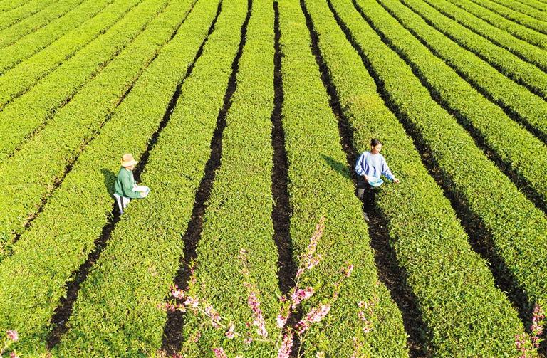 4月2日,村民在黔西市中坪镇飞蛾村茶园采茶。清明时节,贵州多地茶场进入明前茶采摘忙碌期,村民们不负春光抓紧时间采摘、加工新茶,供应市场。贵州坚持绿水青山就是金山银山理念,立足土壤、气候、海拔等自然优势,大力发展绿色生态茶产业,带动农户增收致富、积极助推乡村振兴。