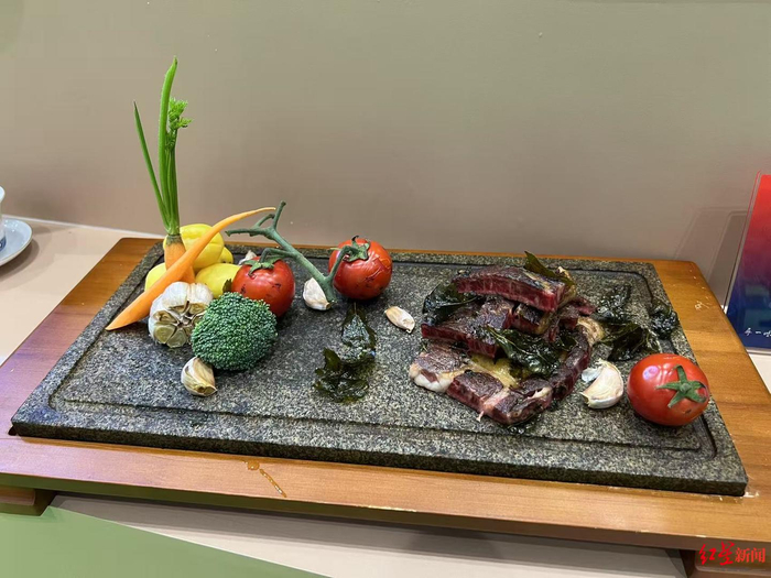融合寻香总经理李春告诉记者,“茶餐”这一形式是由主厨团队在今年年初创新打造,用茶叶炖汤、茶汤浸泡、茶叶油煎等烹饪方式,将茶元素与食材进行充分融合。“例如,在高山古树枇杷茶香煎阿坝牦牛’这道菜中,我们将牛排提前用茶汤浸泡12小时,让茶香浸入牛排,随后煎制。这样能在保证原汁原味食材味道的同时,激发出牛排和茶叶的别样风味,这也是最受欢迎的一道茶餐’。”
