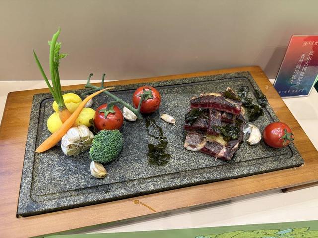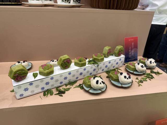 馆内一展位发出阵阵香味,吸引了不少观众。走进一看是厨师在用茶叶“做菜”,有邛崃黑茶香煎牛肉;碾碎成粗粒干煸烹制竹韵茶馨焗皇虾;慢炖的鸡汤加入陈年黑茶,配上鲜竹荪、鲜羊肚菌和金耳菌等;茶粉与绿豆制成的“熊猫”形状糕点等。除了成都特色茶创新研发的“茶餐”,还有绿茶啤酒等新式茶饮等。