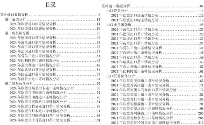 在茶类结构方面,《报告》详尽解析了红茶和绿茶在欧盟进出口中的占比、增长态势及其内部规格差异;在成员国市场分析中,重点聚焦德国、波兰、法国、荷兰、爱尔兰等多个重要成员国的进出口情况并逐一剖析,揭示了各国独特的市场特征和消费偏好,如:德国是最大的进口国,而波兰则在出口贸易中扮演重要角色等;在贸易格局方面,《报告》梳理了中国、印度、斯里兰卡等主要进口来源国,以及美国、英国、澳大利亚等关键出口市场之间的贸易动态。清晰呈现了欧盟茶叶市场的结构性特征与国别差异,力求为读者描绘一幅完整的欧盟茶叶贸易全景图。