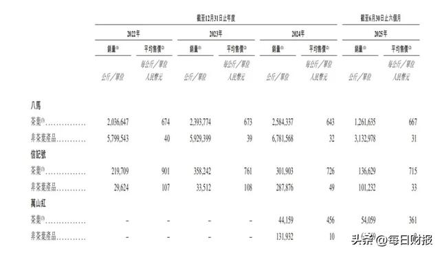 具体到产品,其高端定位也遭遇压力。主推的高端普洱品牌“信记号”,平均售价从2022年的每公斤901元,持续下滑至2025年上半年的715元。